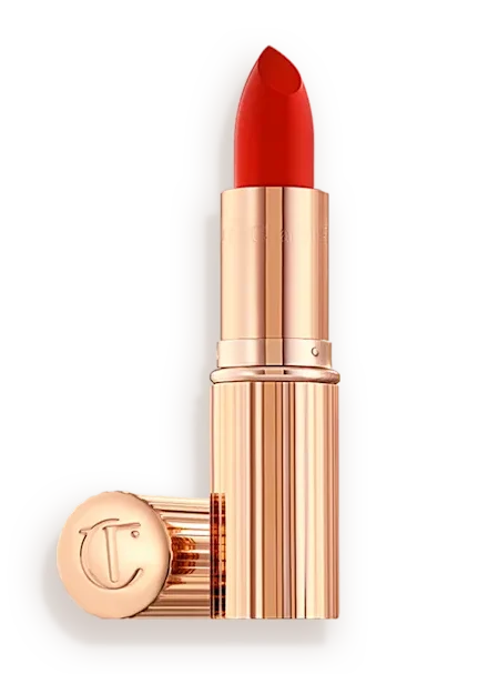 Una barra de labios hidratante en un rojo cálido intenso para un look de labios satinado y luminoso.