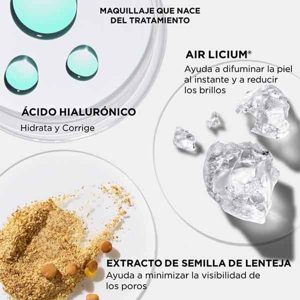 Su fórmula posee Air Licium un ingrediente que absorbe instantáneamente el brillo, 3% de complejo de semilla de lenteja para minimizar los poros, y ácido hialurónico para hidratar la piel y ofrecer una sensación cómoda.