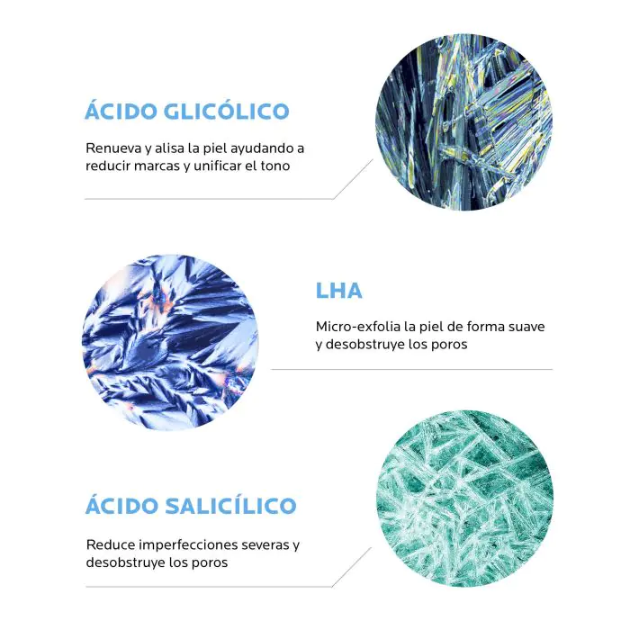 El Ácido Glicólico activa la renovación de la piel, ayudando a mejorar su textura y luminosidad. Ácido Salicílico para desobstruir los poros y reducir la acumulación de sebo y LHA para exfoliar suavemente la piel. La Niacinamida ayuda a mejorar el tono de la piel y a minimizar los poros.