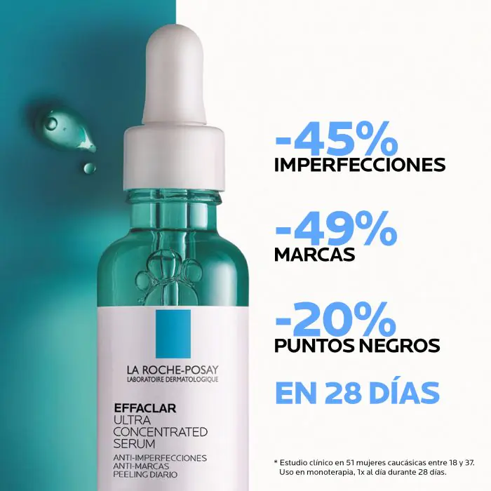 Effaclar Serum Anti Imperfecciones Ultra Concentrado es un tratamiento concentrado que combina un Complejo triácido exfoliante (Ácido glicólico + Ácido Salicílico + LHA) con Niacinamida, para tratar imperfecciones, marcas, poros visibles y puntos negros.
