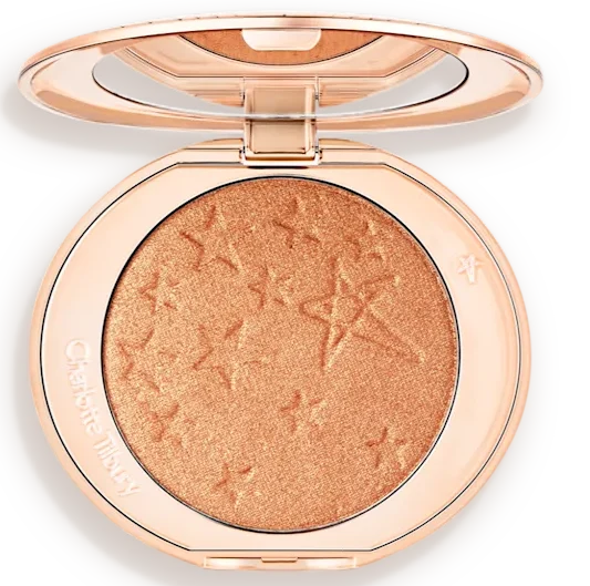 Estos polvos iluminadores en un genuino rosa dorado son como un AMANECER en un bote.